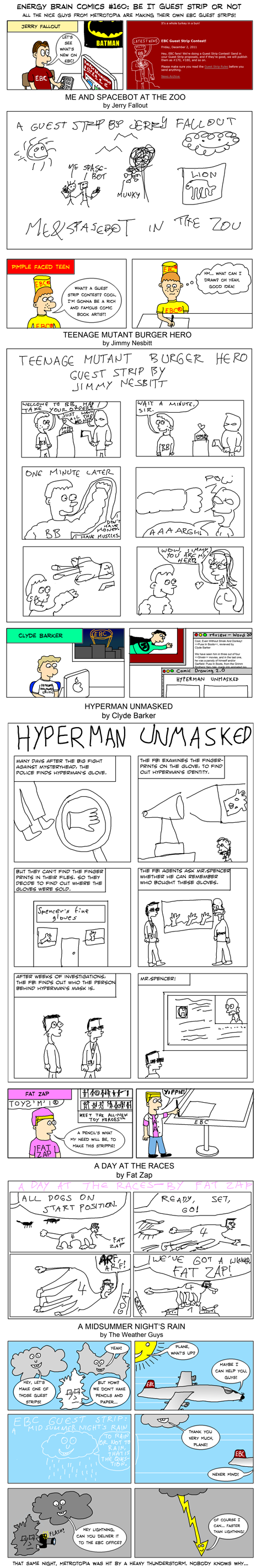The Secret Identity Of Hyperman | In this strip, the most important information about Hyperman is revealed: His secret identity. He's a movie critic, and I bet he prefers to review Superhero movies. | Barker, Clyde; Curlhead; Fallout, Jerry; Pimple Faced Teen; Spacebot 4000 |